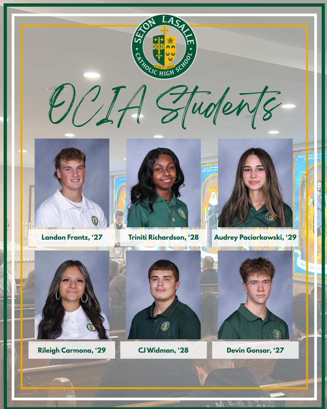 Last week, six of our students: Landon Frantz, ‘27, Triniti Richardson, ‘28, Audrey Paciorkowski, ‘29, Rileigh Carmona, ‘29, CJ Widman, ‘28, and Devin Gonsar, ‘27, participated in the Rite of Entrance as part of our OCIA program. Co-Chaplain and Alumnus, Father John Kist, ‘15, helped prepare them and celebrated the Rite. Father Kist, '15 stated, "These students have met frequently throughout the year to learn about the Catholic faith, to learn to pray, and to encounter God. This step represents their response, a response that ultimately leads to becoming a full member of the Catholic faith. OCIA is one of the ways that the Lord draws new members to his family, the Church. These students have been drawn by the Lord and have begun to answer his call.".